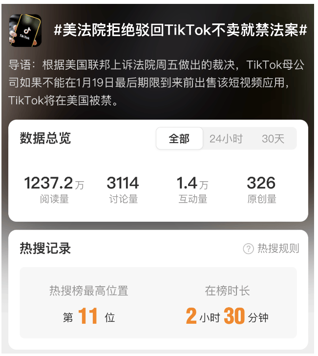 当地时间12月18日,美国最高法院宣布将就禁止TikTok在美国运营的法案再次进行讨论。据报道,美国最高法院将于1月10日就此案进行辩论,允许...