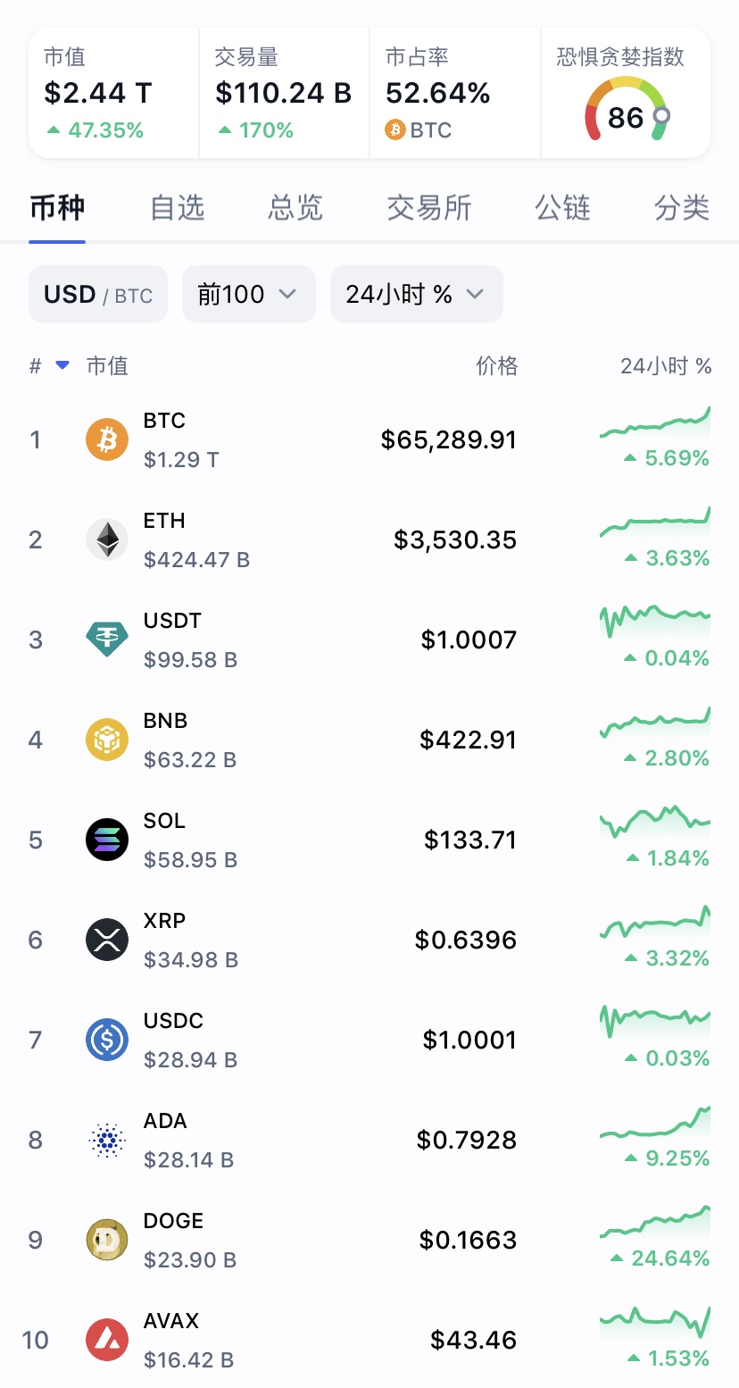 根据CoinMarketCap数据显示,北京时间3月4日凌晨,比特币维持在6.2万美元左右,上午7时左右迎来一波较大涨幅,突破6.4万美元后快速下跌到6.2万美元,下午3时左右再度迎来一波涨幅,一路上涨至6.55万美元。截至发稿前,比特币价格徘徊在6.5万美元左右,市值接近1.3万亿美元。