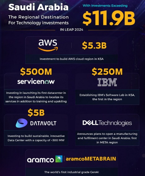 仅在第一天,亚马逊AWS等多家公司就宣布将向主办国沙特阿拉伯总共投资超100亿美元建设数据中心,以支持科技初创企业在当地的发展。