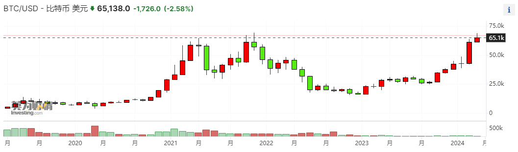 在黄金刷新高近两个小时后,根据Coin Metrics的数据,比特币的价格短暂达到69,210美元,也刷新了2021年11月10日创下的68,982.20美元纪录。但之后明显回落,最新报65,138美元。