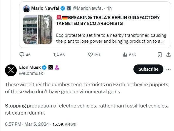 对此,马斯克在X平台表示,这些要么是地球上最愚蠢的生态恐怖分子,要么是那些并不持有环保目的的人的傀儡。停止生产电动汽车,而不是化石燃料汽车,这是极端愚蠢的。