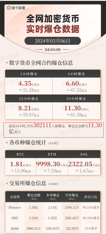 值得注意的是,就在比特币创新高后马上出现了大跳水。加密货币快涨快跌,近半小时新增爆仓人数超10万人,近一小时爆仓额超4亿美元,最近24时逾30万人爆仓,24小时爆仓金额为11.3亿美元(约合人民币81.3亿元)。