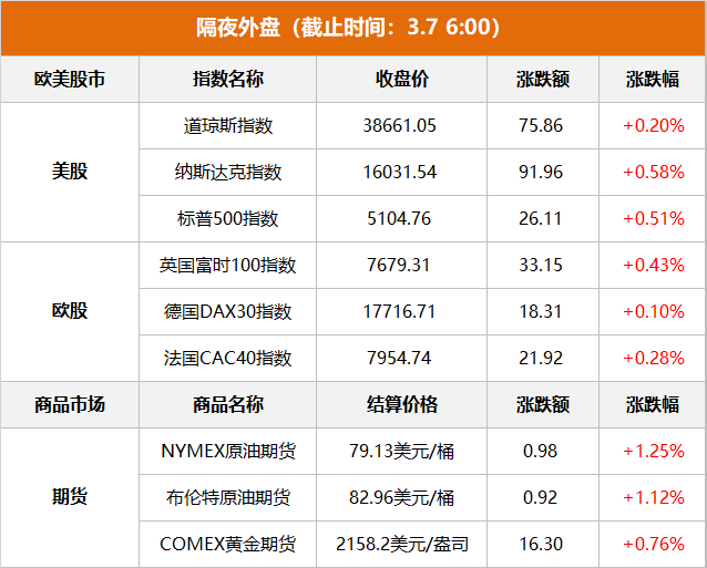 美股市场:美股三大指数集体收涨,道琼斯工业平均指数比前一交易日上涨75.86点,收于38661.05点,涨幅为0.20%;纳斯达克综合指数上涨91.96点,收于16031.54点,涨幅为0.58%;标准普尔500种股票指数上涨26.11点,收于5104.76点,涨幅为0.51%。
