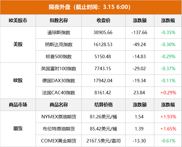 美股市场:美东时间周四,美股高开低走,三大指数集体收跌。道指跌137.66点,跌幅为0.35%,报38905.66点;纳指跌49.24点,跌幅为0.30%,报16128.53点;标普500指数跌14.83点,跌幅为0.29%,报5150.48点。美国2月PPI数据显示整体通胀率连续第二个月超过预期、通胀仍在升温,再次巩固了市场对美联储不会急于降息的预期。PPI数据公布后美债收益率攀升,令股指承压。