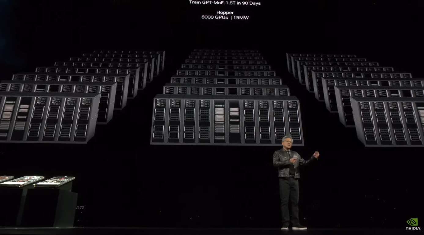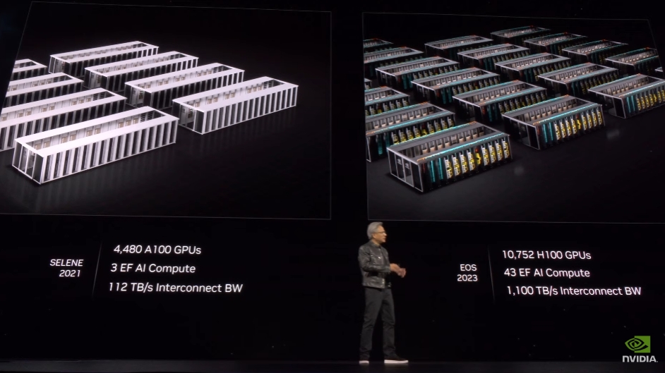 老黄现场对比Blackwell架构和Grace Hopper架构的GPU。