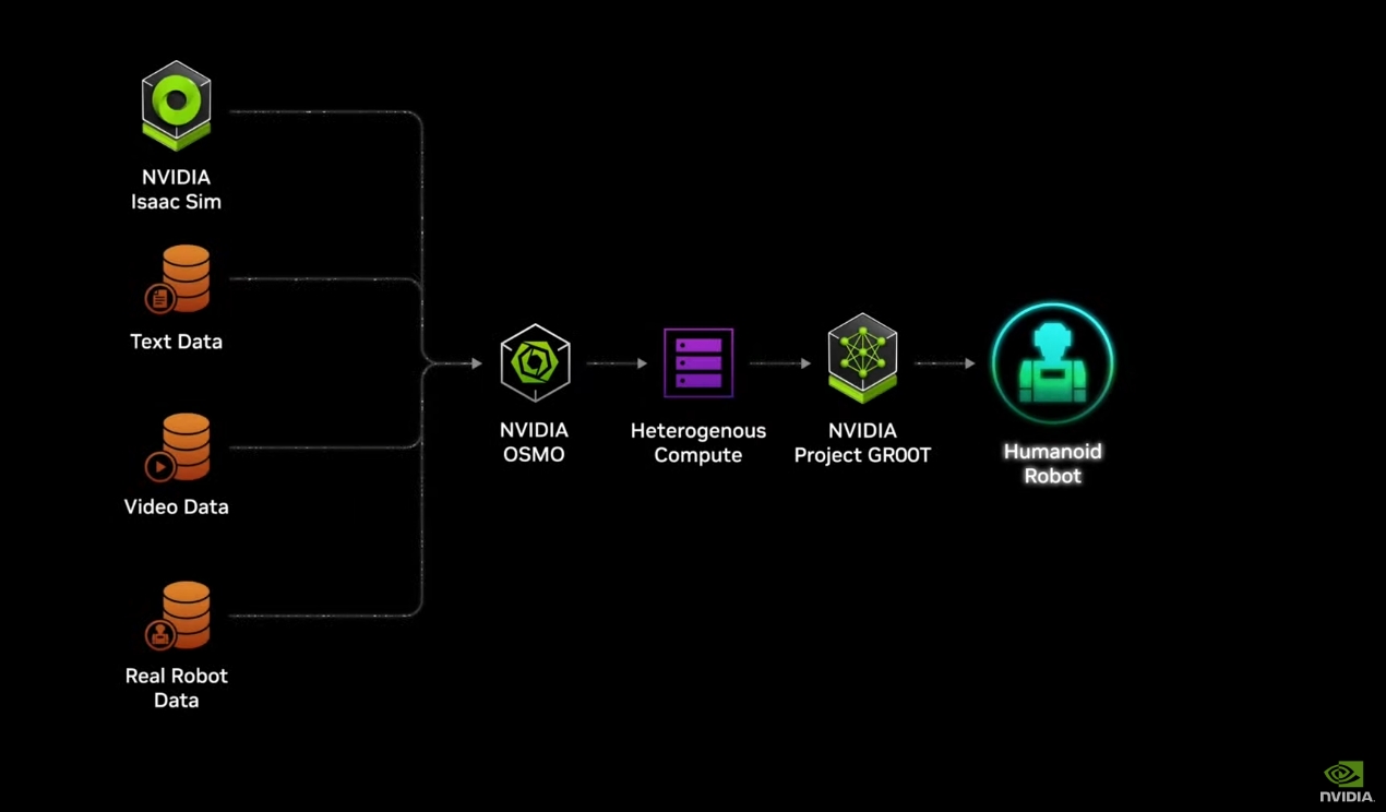 开始提机器人了。黄仁勋表示,在我们的世界里,类人机器人很有可能会发挥更大的作用,我们设置工作站、制造和物流的方式,并不是为人类设计的,而是为人类设计的。因此,这些人类或机器人的部署可能会更有成效。黄仁勋同时宣布一项名为GR00T的项目,旨在进一步推动英伟达在机器人和具身智能的突破性工作。由GR00T驱动的机器人可以理解自然语言,并通过观察人类动作来模拟运动。