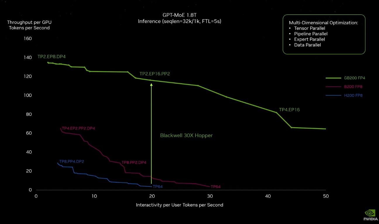 把芯片做大的好处:单GPU每秒Token吞吐量翻了30倍。