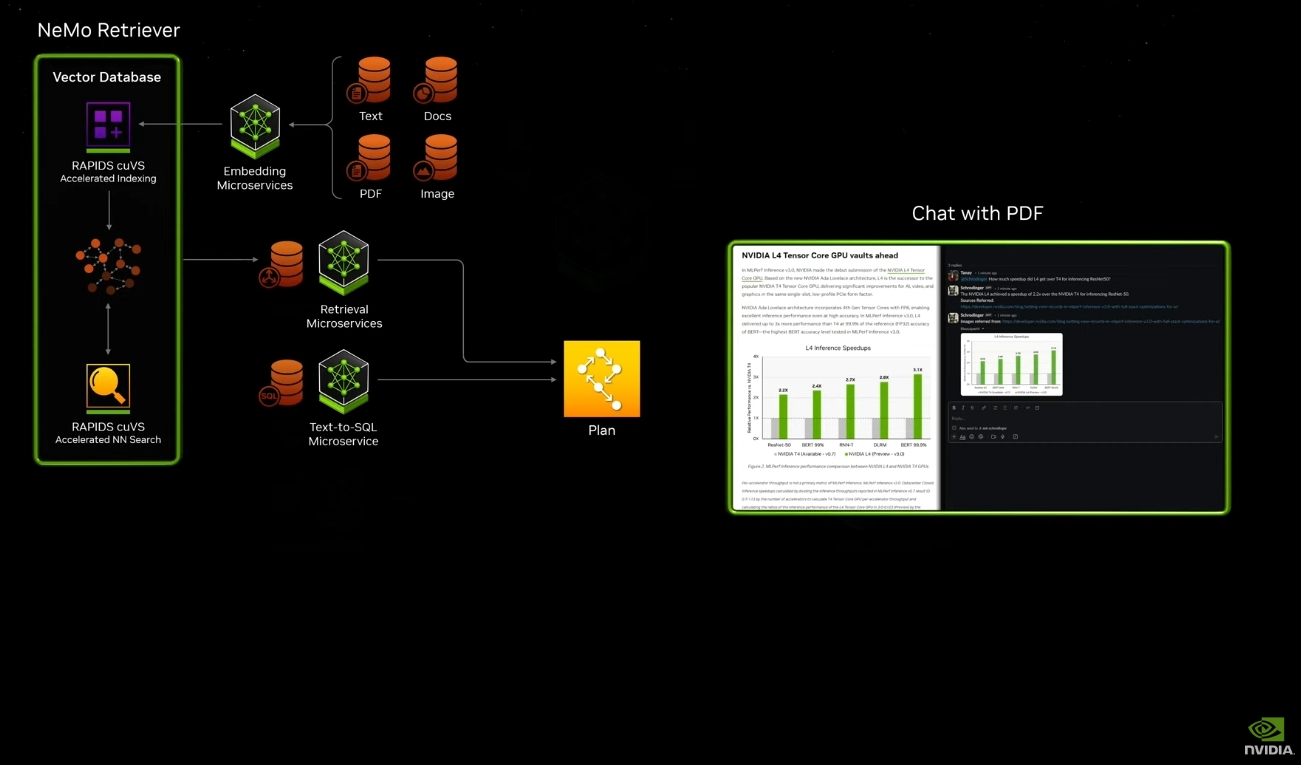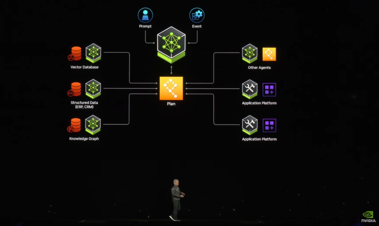 黄仁勋宣布新的AI微服务,用于开发和部署企业级生成式AI应用。老黄表示,未来如何开发软件?与现在一行行代码不同,未来可能就要靠一堆NIMs(Nvidia inference micro service),用与AI聊天的形式调动一堆NIMS来完成训练、应用的部署。英伟达的愿景是成为AI软件的“晶圆厂”。