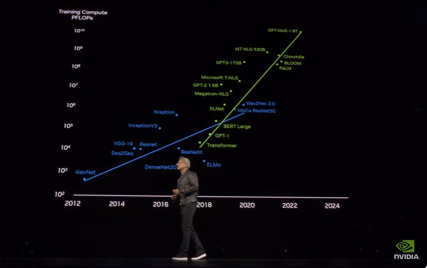 随着transformer模型被发明,我们能以惊人的速度扩展大型语言模型,实际上每六个月就能翻一番。而为了训练这些越来越大的模型,我们也需要更强的算力。