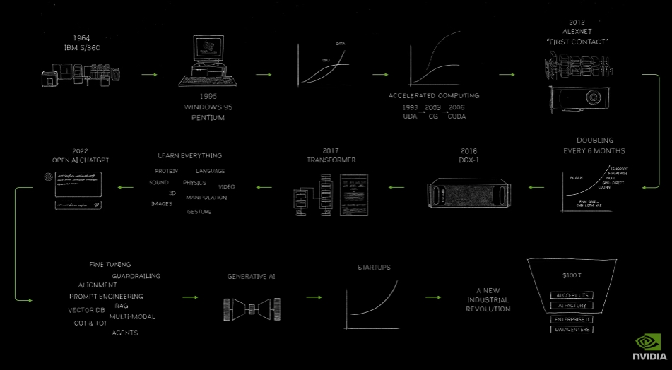 黄仁勋展示英伟达发展史,又提了将首台DGX One送给OpenAI的故事。