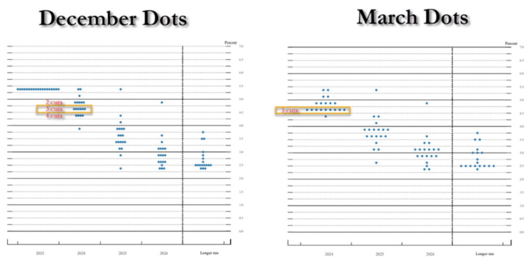 相比去年12月公布的点阵图,最新的点阵图预期中值显示,本次美联储官员对今年降息次数的预测更加集中为三次。在提供利率预测的19名联储官员中,共有15人预计今年利率会降至5.0%以下,较上次如此预测的人数少一人。