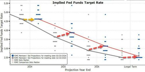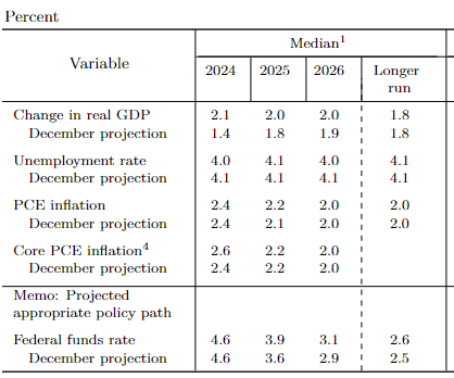 不过,2025年的利率预测上调至3.9%(此前为3.6%),这意味着明年只会降息3次,低于2023年12月美联储会议后预期的4次。2026年的利率预测同样上调了25BP。