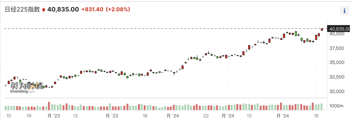 经历了上两周的盘整,本周日经指数再度大涨,3月21日,日本股市收盘再度突破历史新高,冲上40000点。