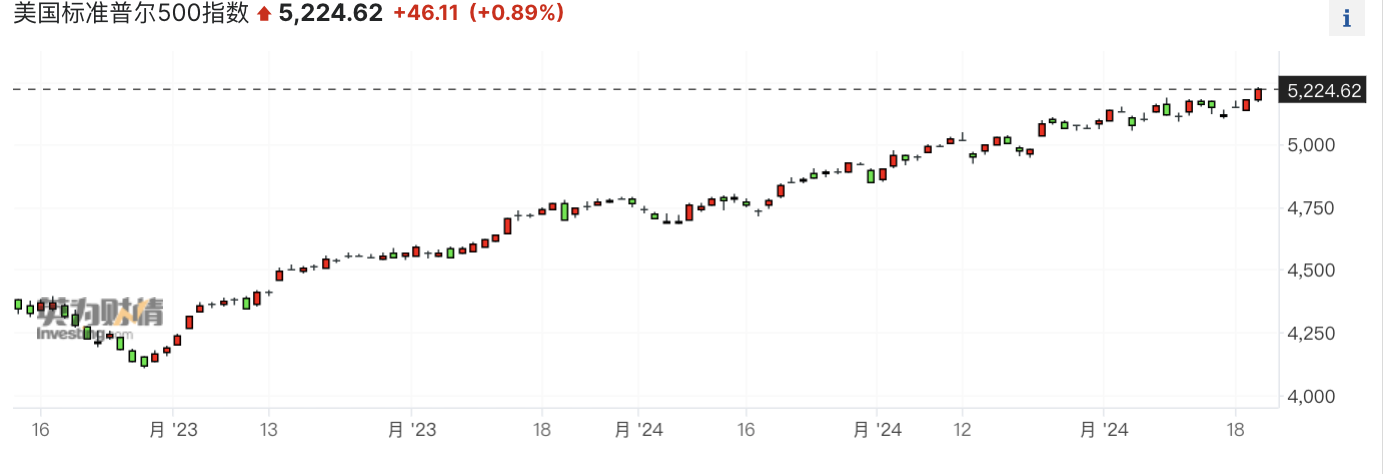 在意外的鸽派信号下,美股势不可挡,收盘创历史新高。截至北京时间3月21日收盘,标普500指数涨0.89%报5224.62;纳斯达克100指数涨1.15%报价18240.11。