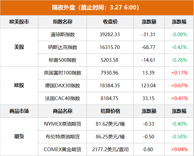 商品市场:国际油价上涨,截至当天收盘,纽约商品交易所5月交货的轻质原油期货价格下跌33美分,收于每桶81.62美元,跌幅为0.4%;5月交货的伦敦布伦特原油期货价格下跌50美分,收于每桶86.25美元,跌幅为0.58%。纽约商品交易所黄金期货市场交投最活跃的4月黄金期价上涨0.80美元,收于每盎司2177.2美元,涨幅为0.04%。