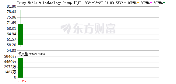 周二(3月26日)美股早盘,特朗普媒体科技集团(Trump Media & Technology Group,TMTG,股票代码:DJT)早盘一度跳涨超50%,最高报每股79.38美元。