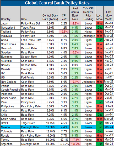 确实,新兴市场央行里,如今有许多央行的基准利率依然要高于美联储,这在利差因素方面似乎看上去还不利于美元。但是别忘了——目前已经步入降息周期的央行里,绝大多数都可是新兴市场央行,而且不少央行的降息幅度已经不小,他们的政策转变时间点可要比美联储快上许多。