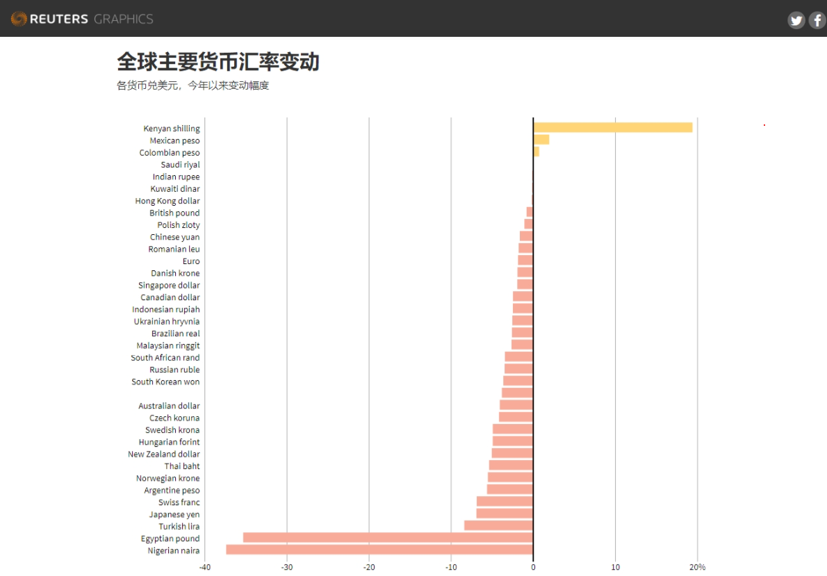 下图涵盖了全球35类主要货币年内兑美元的涨跌排名。令许多人可能没想到的是,今年只有三类非美货币——肯尼亚先令、墨西哥比索和哥伦比亚比索兑美元实现了上涨。其他非美货币中除了与美元挂钩的沙特里亚尔外,全部出现了下跌。