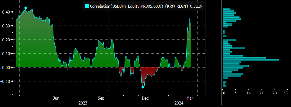 反倒是一些其他亚洲货币,眼下似乎正在步日元的后尘。例如,韩元和印尼盾目前已经纷纷跌至了去年11月以来的最低水平。在关联系数方面,韩元与日元的60日相关指数已达到0.35,为自2023年5月以来的最高水平。数值为1,表示这两个货币完全同步移动。