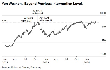 行情数据显示,美元兑日元在日内早间曾一度最高触及了151.97,逾越了2022年10月曾引发日本央行进行直接外汇干预的151.95,这也是该货币对自1990年7月以来从未触及过的高位水平。