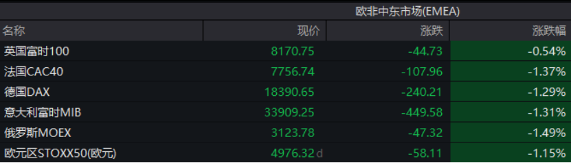 上述消息,再度打击了欧洲的股市。周四,欧洲主要股指低开低走,截至券商中国记者发稿,法国CAC40指数跌1.37%,德国DAX指数跌1.29%,意大利富时MIB指数跌1.31%,英国富时100指数跌0.54%。