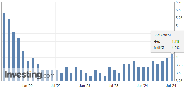 数据还显示,美国6月失业率意外升至4%,为2021年11月以来新高,市场原先预计会维持在4%不变。