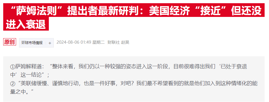 即使是“萨姆法则”提出者、美联储前经济学家萨姆(Claudia Sahm)也认为“美国还没有到衰退的那一步”,并指出美联储不宜立即采取行动,在这样的时刻,保持冷静很重要。