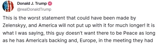 3日晚些时候,美国总统特朗普在社交媒体上发文,对泽连斯基的最新视频声明作出回应。特朗普表示,乌克兰总统泽连斯基的声明可能是他做出的“最糟糕的”声明,美国“不会再容忍更久了”。