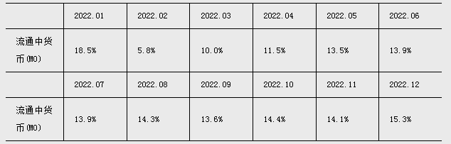 注4:自2022年12月起,“流通中货币(M0)”含流通中数字人民币。12月末流通中数字人民币余额为136.1亿元。修订后,2022年各月末M1、M2增速无明显变化。修订后M0增速如下: