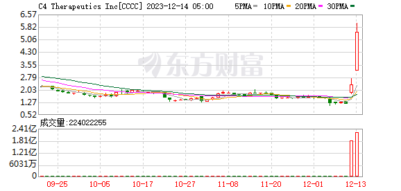 周三(12月13日)美股盘中,美国生物制药公司C4 Therapeutics的股价暴涨超120%,现报每股5.29美元,为今年3月以来的最高水平。该股昨日已收涨98.31%,今日的上升势头却依然不减。