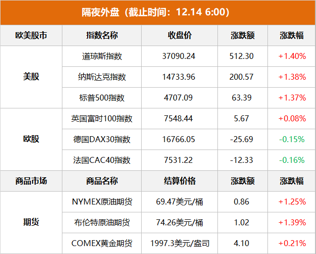 美股市场:美股三大指数集体收涨,截至收盘,道琼斯指数突破37000点,比前一交易日上涨512.30点,收于37090.24点,涨幅为1.40%,创历史新高;纳斯达克指数上涨200.57点,收于14733.96点,涨幅为1.38%;标普500指数上涨63.39点,收于4707.09点,涨幅为1.37%,纳指、标普500指数创去年年初以来新高。美联储将联邦基金利率目标区间维持在5.25%至5.5%的水平不变,点阵图显示预计2024年将降息75基点。美联储主席鲍威尔表示,在今天的会议上讨论了降息时机。