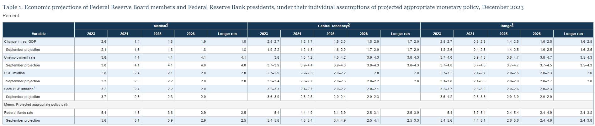 FOMC的预测中值显示2024年降息75个基点至4.6%