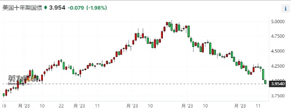 行情数据显示,10年期美债收益率日内最新已跌至3.954%附近,与美联储利率预期关联最为紧密的2年期美债收益率,在隔夜重挫31个基点后也继续延续着跌势,亚洲时段再度录得了约11个基点的两位数跌幅。