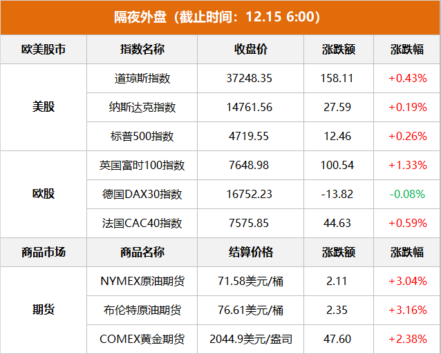 商品市场:国际油价上涨,截至当天收盘,纽约商品交易所2024年1月交货的轻质原油期货价格上涨2.11美元,收于每桶71.58美元,涨幅为3.04%;2024年2月交货的伦敦布伦特原油期货价格上涨2.35美元,收于每桶76.61美元,涨幅为3.16%。纽约商品交易所黄金期货市场交投最活跃的2024年2月黄金期价14日上涨47.6美元,收于每盎司2044.9美元,涨幅为2.38%。