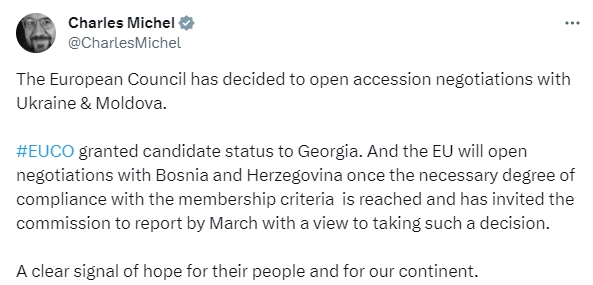 当地时间周四,为期两天的欧盟峰会在比利时布鲁塞尔举行。当天晚些时候,欧洲理事会主席米歇尔在社交媒体上表示,欧洲理事会决定与乌克兰和摩尔多瓦开启入盟谈判。