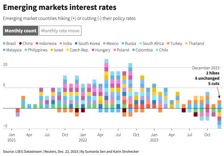业内统计的18家发展中经济体央行中,有13家央行在12月召开了利率制定会议,其中有多达五家央行宣布降息,数量为至少三年来最多。捷克的决策者在年内最后一个月启动了宽松周期,而巴西、匈牙利、哥伦比亚和智利央行则是将宽松力度增加一倍。