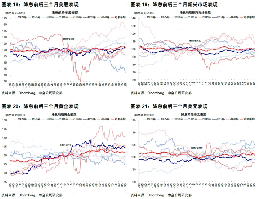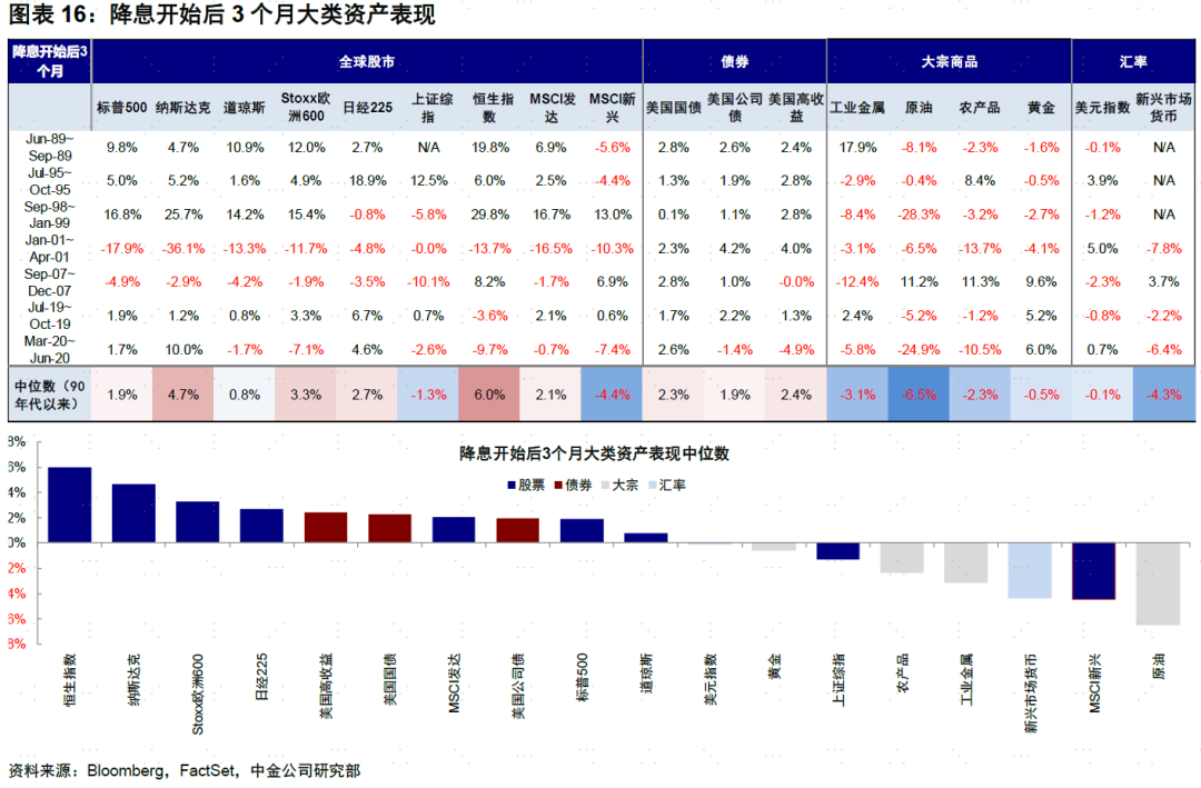 根据中金的研报,尽管历史经验较为有限,依赖简单加平均会掩盖掉个体差异,但他们仍总结归纳了如下美联储降息初期的普适性规律: