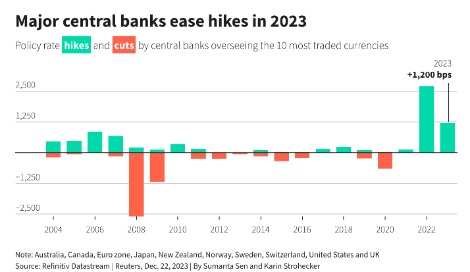 放眼全年,根据业内的统计,10国集团(G10)央行今年迄今总共加息38次,累计加息幅度为1200个基点,还不到2022年54次加息2700个基点的一半。
