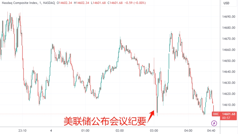 正因如此,今日继续深度下跌的美股市场在会议纪要发布后,一度随着新闻标题拉升了一小会儿,后续又躺回了原来的位置。