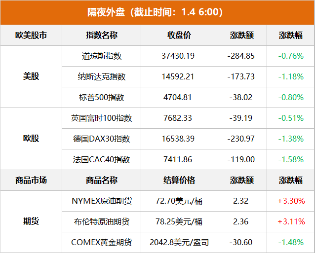 商品市场:国际油价显著上涨,截至当天收盘,纽约商品交易所2024年2月交货的轻质原油期货价格上涨2.32美元,收于每桶72.70美元,涨幅为3.3%;2024年3月交货的伦敦布伦特原油期货价格上涨2.36美元,收于每桶78.25美元,涨幅为3.11%。纽约商品交易所黄金期货市场交投最活跃的2024年2月黄金期价3日下跌30.6美元,收于每盎司2042.8美元,跌幅为1.48%。