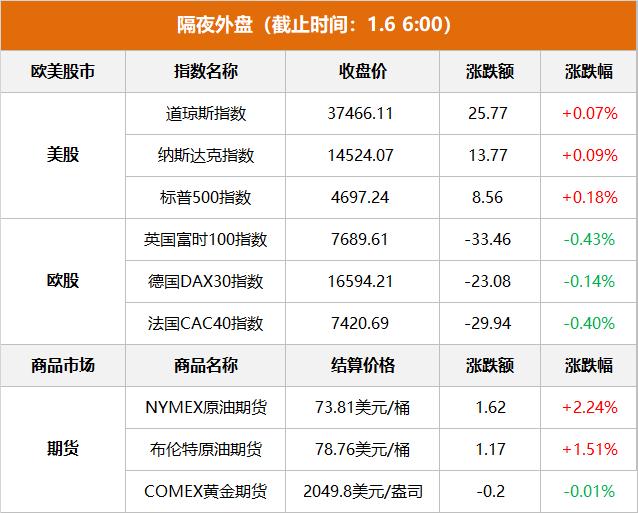 美股市场:美股小幅收涨,截止收盘,道指涨25.77点,涨幅0.07%,报37466.11点;纳指涨13.77点,涨幅0.09%,报14524.07点;标普500指数涨8.56点,涨幅0.18%,报4697.24点;本周,道指累跌0.59%,纳指累跌3.25%,标普500指数累跌1.52%,三大指数均终结周线九连涨。数据方面,12月非农数据超预期(公布值为增加21.6万人,预估为增加17.5万人),美联储掉期对美联储3月降息25个基点的可能性重新定价,现押注3月降息可能性为70%。