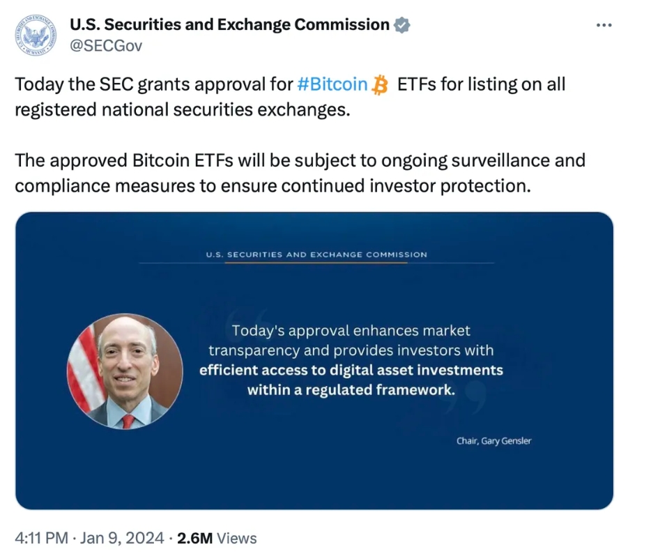 事情的起因是在美东时间1月9日晚间,美国证券交易委员会在X(前身为Twitter)上的官方社交媒体账户发布了一则通知,声称已批准比特币交易所交易基金(ETF)上市。