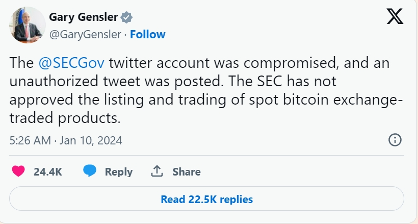 随后,这一X账户上的消息被立即删除。片刻之后,SEC主席加里·詹斯勒在自己的个人账户上发帖说,该机构的官方账户“遭到入侵,并发布了一条未经授权的推文”。