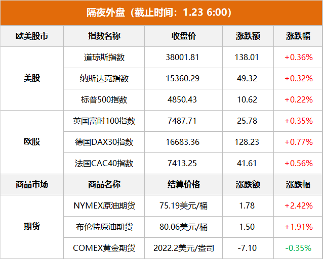 商品市场:国际油价上涨,纽约商品交易所2月交货的轻质原油期货价格上涨1.78美元,收于每桶75.19美元,涨幅为2.42%;3月交货的伦敦布伦特原油期货价格上涨1.50美元,收于每桶80.06美元,涨幅为1.91%。国际金价下跌,COMEX 2月黄金期货22日下跌7.1美元,收于每盎司2022.2美元,跌幅为0.35%。