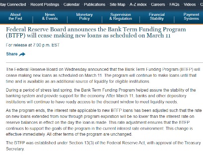 美联储在其新闻稿中称,在去年春季的紧张时期,银行定期融资计划帮助确保了银行系统的稳定,并为经济提供了支持。3月11日之后,银行和其他存款机构将继续可以随时利用贴现窗口来满足流动性需求。