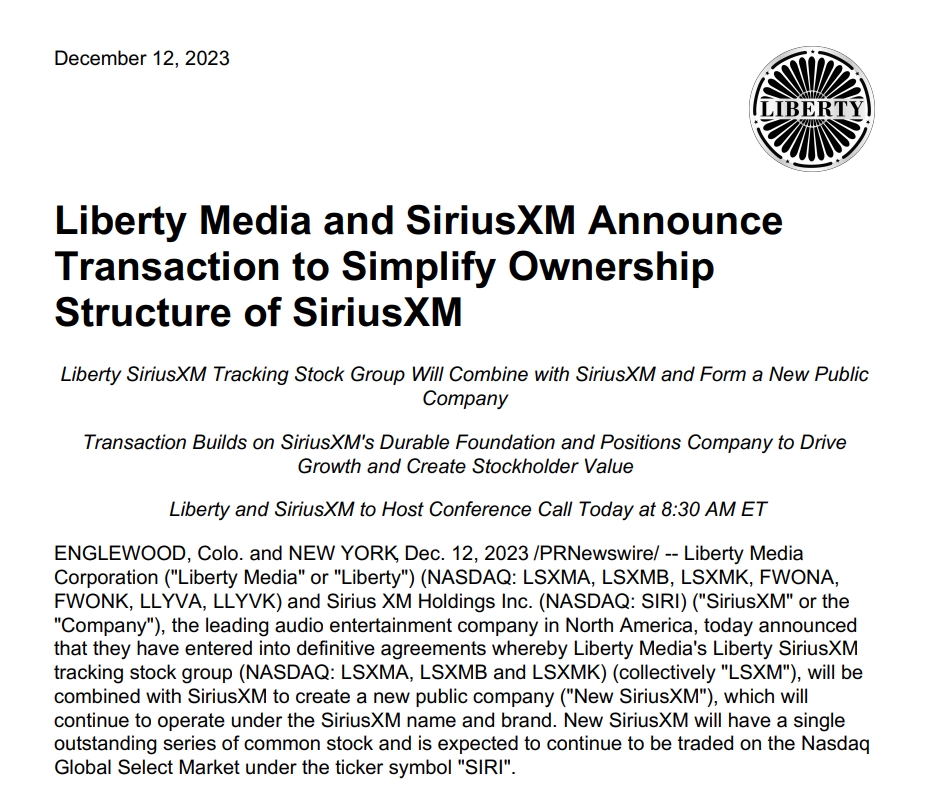去年12月12日,自由媒体集团与天狼星XM宣布,双方决定简化追踪股的交易结构。自由媒体天狼星XM追踪股集团(也就是LSXMA、LSXMK和LSXMB),将与天狼星XM进行合并,合并后的新公司保留天狼星XM的品牌和交易代码“SIRI”。双方预期,这笔交易将在2024年三季度初完成。