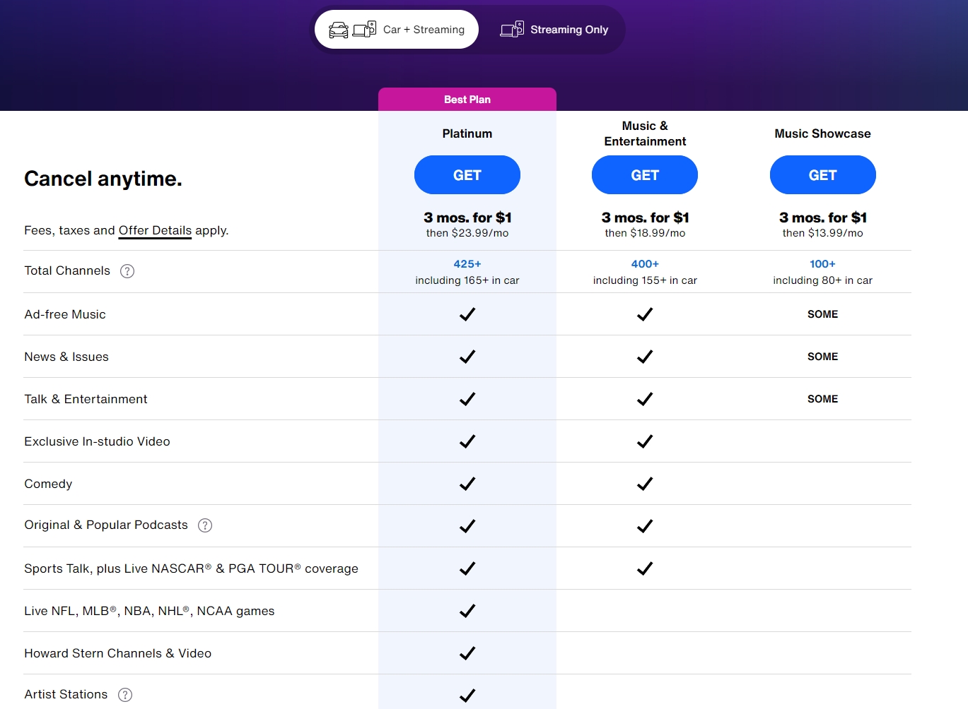 天狼星XM提供订阅制卫星广播、在线广播等服务,目前公司总共拥有6颗在轨卫星,为美国、加拿大的用户提供400多个广播频道。官网显示,“车载+流媒体”订阅的服务费用为每月13.99美元-23.99美元不等。公司目前的付费订阅用户数为3400万。