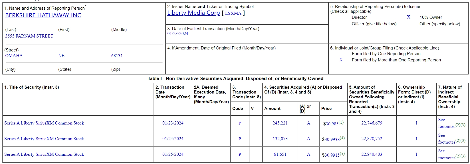 根据美国SEC公告平台上的数据显示,伯克希尔公司在本周二、三、四接连买入140万股追踪自由媒体集团旗下天狼星XM权益的追踪股(LSXMA、LSXMK)。