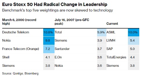 回溯到2000年3月,德国电信公司(Deutsche Telekom AG)、法国电信公司(France Telecom SA,后更名为 Orange SA)和诺基亚等电信类股票,曾是欧洲投资者心头的最爱,约占该指数的28%。