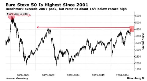 目前,尽管欧洲斯托克50指数距离历史最高点还有约15%的差距,但阿斯麦和思爱普股价的持续上涨,已成为该指数最新的乐观迹象,表明曾经由石油巨头和银行主导的欧洲这一蓝筹股指数,已经发生了根本性的变化。